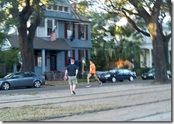 These costumes cracked me up. At the start, there was a group of about 6 of these people. They were the “Who Dat” runners…4 girls and 2 guys. They all wore tutu’s made out of black and gold tulle. I can’t get my husband to even walk a 5K much less run a Half Marathon in a tutu. Pretty cool!